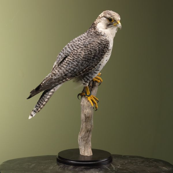 Taxidermie is de kunst van het prepareren en opzetten van dieren voor tentoonstelling en studie, en de opgezette Falco peregrinus X Falco rusticolus is een prachtig voorbeeld van vakmanschap op dit gebied. Deze hybride valk is zorgvuldig geprepareerd en opgezet om zijn natuurlijke schoonheid en unieke eigenschappen te behouden.